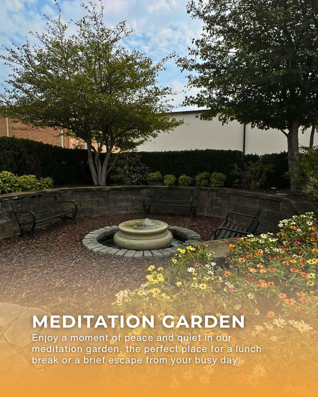 Relaxing outdoor space with benches, chairs, fountain, rocks, and plants.